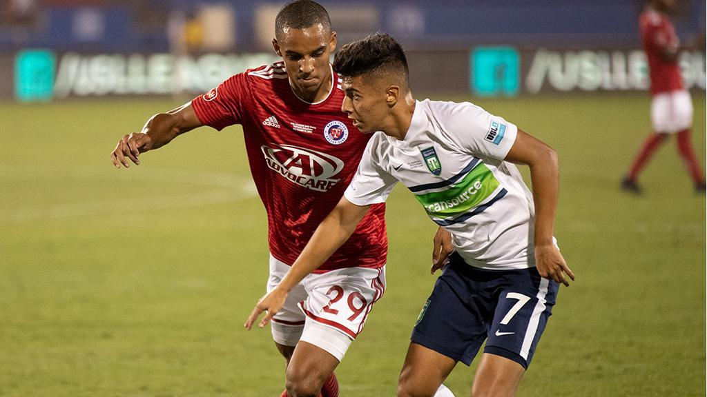 North Texas SC's Bryan Reynolds pressures Greenville Triumph SC's Chris Bermudez during the 2019 USL League One Final at Toyota Stadium. | Photo courtesy North Texas SC