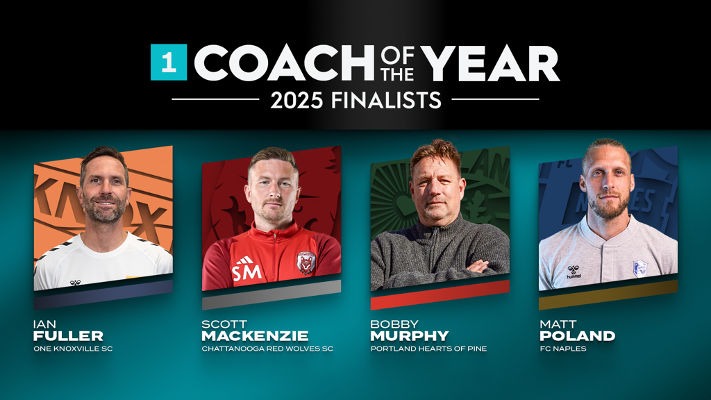 Nine awards finalists will feature in the Semifinals of the 2025 USL League One Playoffs this weekend, with One Knoxville SC’s Sean Lewis, Jordan Skelton and Head Coach Ian Fuller, FC Naples’ Karsen Henderlong and Head Coach Matt Poland, Spokane Velocity FC’s Carlos Merancio and David Garcia and Portland Hearts of Pine’s Nathan Messer and Head Coach Bobby Murphy in line to participate.