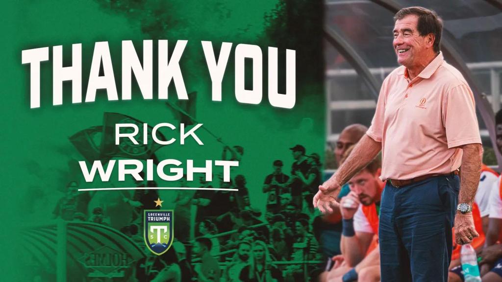 GREENVILLE, S.C. – Greenville Triumph SC announced on Tuesday Head Coach and Technical Director Rick Wright had announced his retirement. Wright served seven seasons on the staff, joining as an assistant to John Harkes ahead of the club’s inaugural season in 2019. He was named head coach prior to the 2024 season following Harkes’ departure and led the Triumph to a playoff berth in his first year as coach.